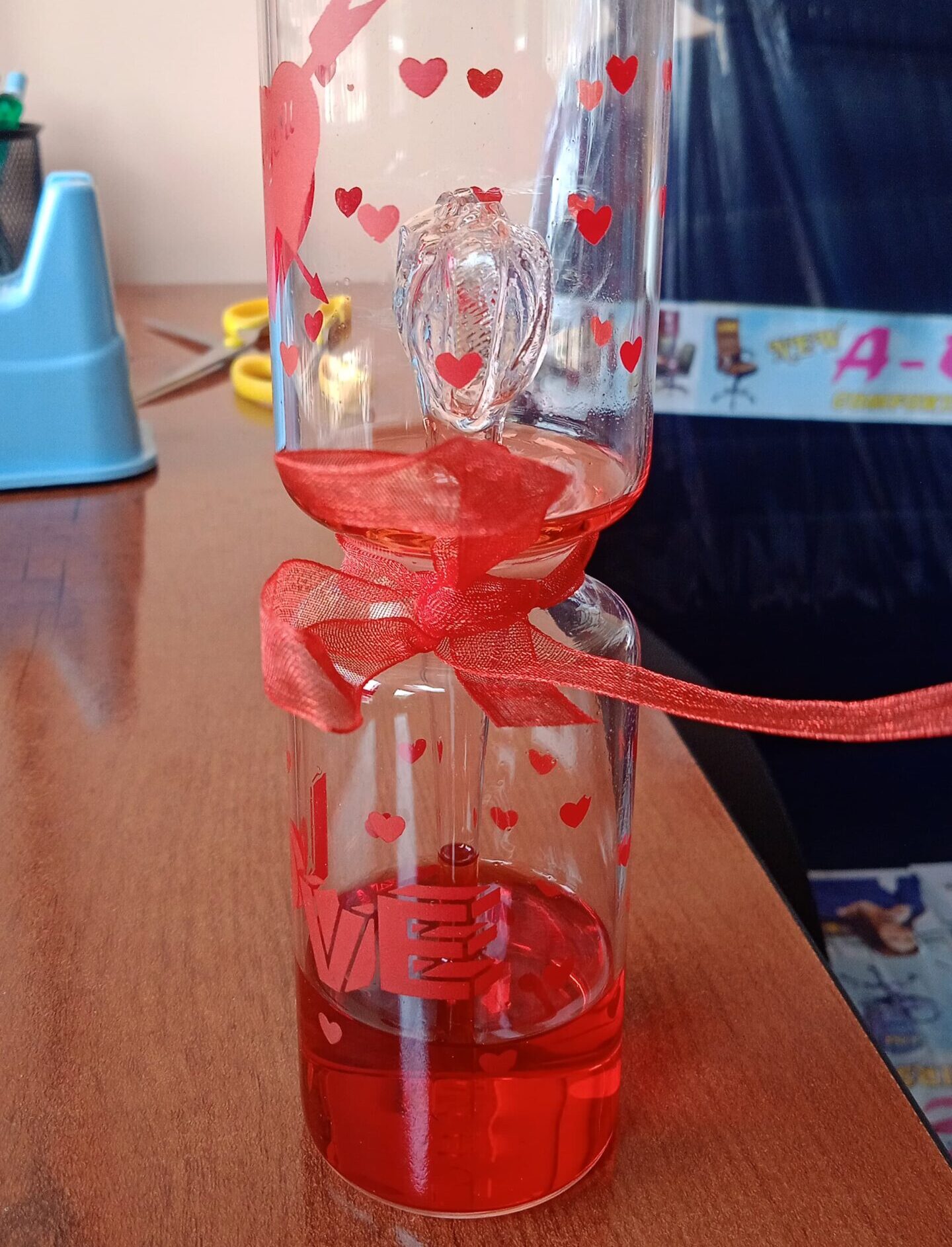 Love Elixir Glass Ornament Celebrate love with this enchanting Love Elixir Glass Ornament—a mesmerizing piece designed to symbolize deep affection and heartfelt connections. Crafted from premium glass, this two-chamber masterpiece features a striking heart-shaped element in the upper chamber, elegantly tied together with a delicate red ribbon. The lower chamber holds a vivid red liquid, enhancing the visual allure and symbolizing the essence of love in its purest form.