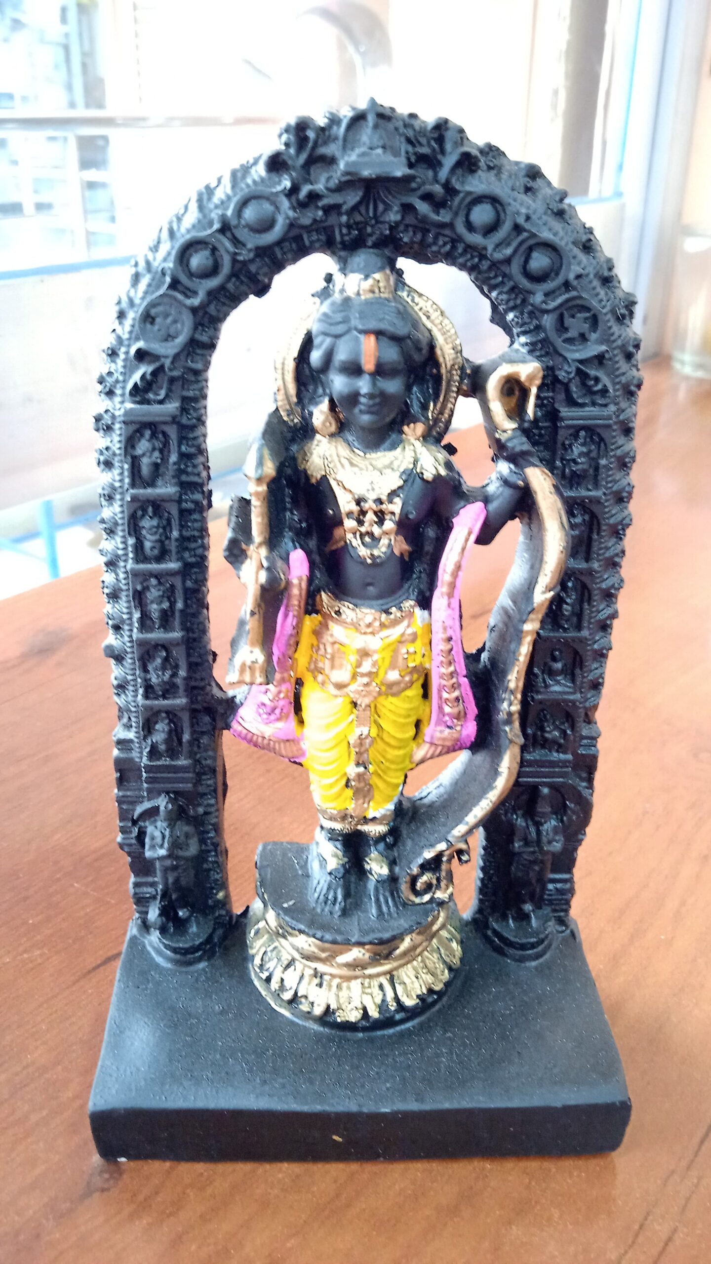 Bring home the sacred presence of Ram Lalla, the youthful form of Lord Rama, radiating purity, wisdom, and divine grace. This intricately crafted idol captures the essence of the revered deity, standing majestically within an ornate archway, holding a bow and arrow—a symbol of righteousness and protection.