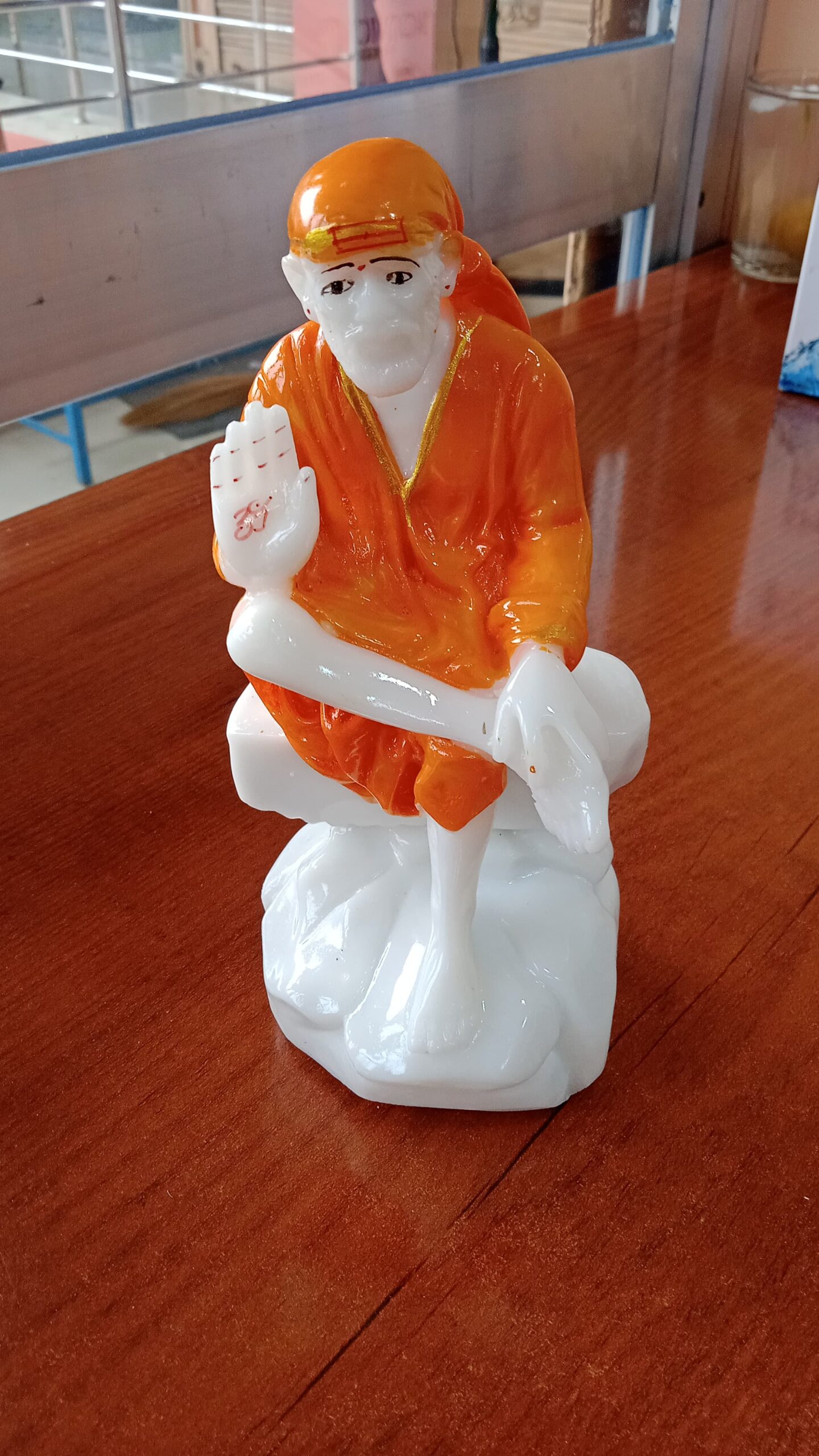 Bring serenity and divine grace into your space with this beautifully crafted Sai Baba statue. Made from high-quality, glossy material, this statue captures Sai Baba seated in a meditative posture, dressed in a vibrant orange robe that radiates warmth and devotion. His right hand is raised in a blessing gesture, symbolizing protection and guidance, while the left hand rests peacefully on his knee.